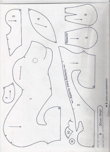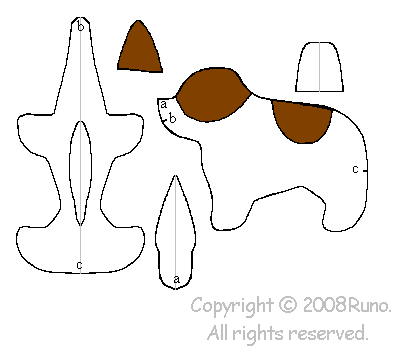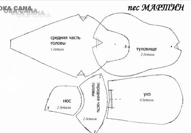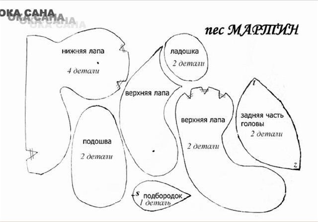 Выкройку вставила к фотографии.Пояснения: брыли по линии АВ нужно вырезать еще две отдельно,подшить с внутренней стороны и прошить,что-бы в них не попала набивка.Пасть подшивается к верхней части внутренней брыли.НОС из искусственной кожи,очень мягкой.в середине нос до половины нужно простегать с внутренней стороны,что бы получилась складка.эта складка вшивается между передней часть морды.Вырезать внутри ничего не нужно,просто подшить по краям вытачки,чтобы внутрь ушла складка.Нижнии губы я подшила черным флисом,снаружи перегнула край 4 мм,а внутрь около 1 см,простегала,и пасть опять подшила к нижней части флиса,так,чтобы пасть ушла немного вниз морды.Глаза примеряла уже на сшитой морде,так что это лучше подобрать вручную.Немного набить синтепоном,примерить,и на это месте вырезать дырки,так,что бы они перекравали сам глаз.Глаза вставляла во флис и подшивала с обратной стороны,а веки обшила черным флисом.Уши я сшивала с лицевой стороны,тогда они не топорщаться.После набивки вышила вручную складки бровей, и морду сильно стянула от носа к середине морды,так что она немного скурносилась,и появились складки на мордочке.Затем прошила пальцы на лапах,а на пятках подшила пальчики,на сайте сказано,как.Когти клеила супермоментом.Клыки покупные,как и глаза. Боюсь,что описание бестолково,так что если что-то неясно,попытаюсь объяснить. Добавлено (06.02.2009, 18:38) --------------------------------------------- У меня еще вот такая дворняжка завалялась.Пыталась нарисовать лабрадора,но он не вышел.  http://foto.rambler.ru/users/tmsch/2/