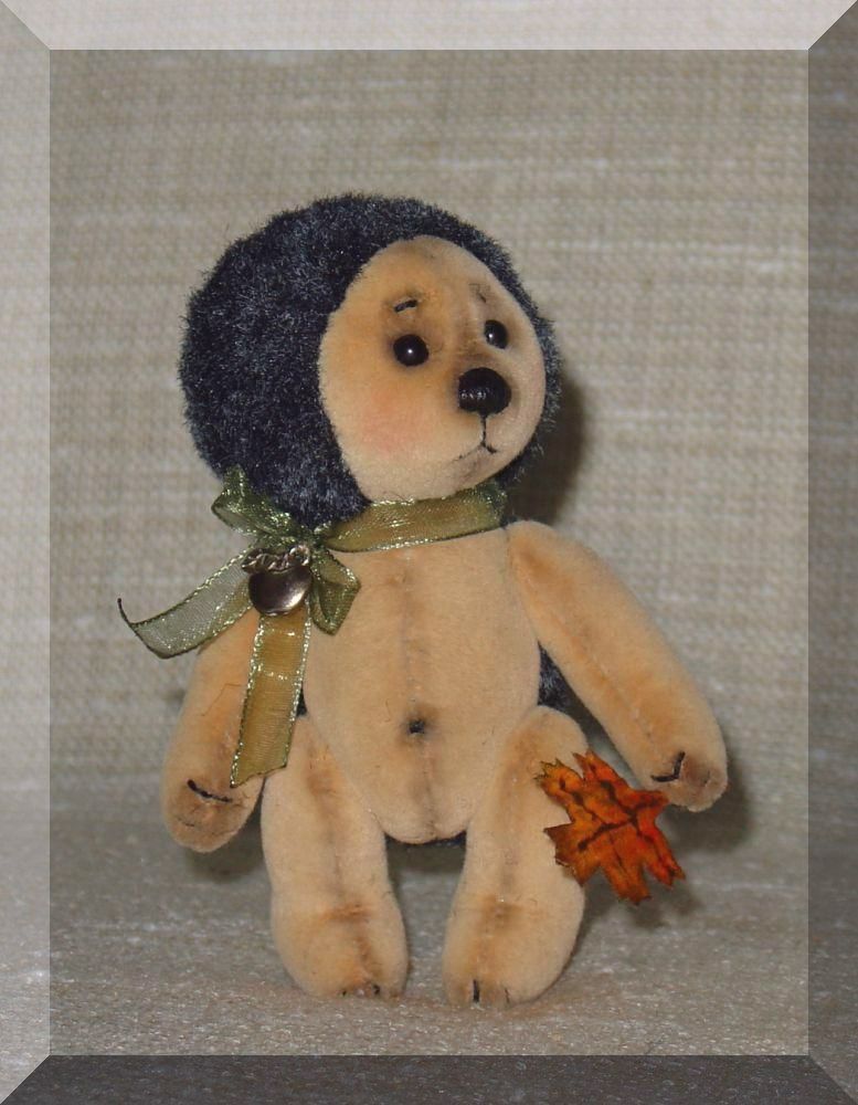 Девочки, спасибо огромное! *** Со второе на третье ноября родился ёжик. Мой первый тедди-ёжик. Обошлась без ежикового мохера, и, как обычно, без шплинтов и стеклянных глазок ) Он сшит из плюша (это колючки), а всё остальное из обивочной (наверно) ткани.. с таким коротки мягким-мягким ворсом... Очень приятный на ощупь! Глаза - бусины, брови, нос и рот вышиты ирисом. Носик покрыт лаком. Щёчки нарумянила цветным карандашом. Тонировка маслом. Руки и ноги на верёвочном шарнире, голова на металлической шпульке. На шее у него бант капроновый и металлическая подвеска "яблоко", выдержанная в марганцовке. В руке лист, вырезанный из лепестка от искусственных цветов и тонированный маслом же. Рост - 11,5 см. Спасибо за Ларисе Ковалёвой за замечательную выкройку!